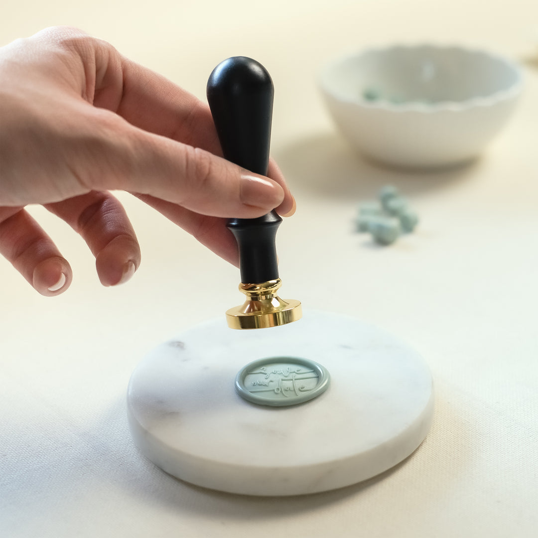 Gieße das geschmolzene Wachs auf deiner erwählten Oberfläche und presse deinen Siegelstempel langsam und mit ein wenig Druck auf das Wachs. Versuche dabei den Siegelstempel so mittig wie nur möglich auszurichten. Lasse den Siegelstempel für 5 - 10 Sekunden im Wachs stehen.