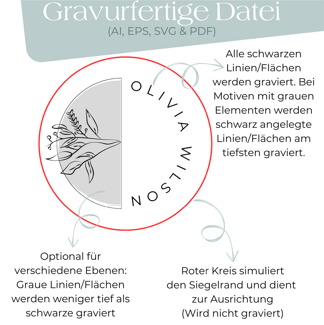 Für Gravuren ist es wichtig, Farben in Graustufen oder Schwarz-Weiß zu verwenden. Farben werden in der Gravur als unterschiedliche Tiefen interpretiert. Schwarz entspricht der tiefsten Gravur, während Weiß nicht graviert wird. Verwende Graustufen, um verschiedene Tiefenstufen zu erzeugen. Wir empfehlen, nicht mehr als drei Gravurtiefen zu verwenden. Ein roter Kreis um das Design sorgt für die gewünschte Ausrichtung und Platzierung und wird nicht mit graviert. - Texte und Illustrationen
